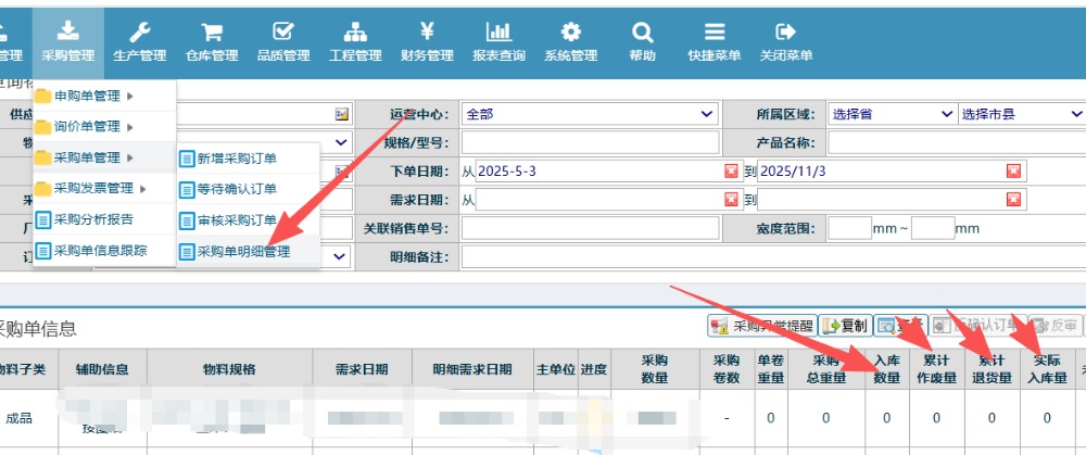 如何在采购单上显示或体现已交数量、未交数量以及订单状态(是否正常结案)?
