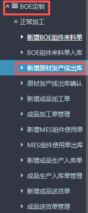 点晴ERP-BOE原材发产线出库流程1.进入ERP系统之后,在左侧功能菜单里找到“BOE定制”,点击“正常加工”,找到“新增原材发产线出库”。 2.进入界面之后,按图操作,选择好发货仓库(备注的话根据情况填写)。 3.接着在界面中填写“物料编码”,点击编码会弹出物料信息窗口。 在弹出的物料信息窗口里,找到对应的原...