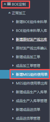 点晴ERP-BOE关于MES组件使用单流程 1.进入ERP系统之后,在左侧功能菜单里找到“BOE定制”,点开后点击“正常加工”,找到“新增MES组件使用单”。 2.进入界面之后,按图操作:根据情况选择入库类型(正常、制损、材损),然后点击选择生产单号。 3.接下来来到下方,先点击“物料编码”,然后会弹出物料界...