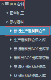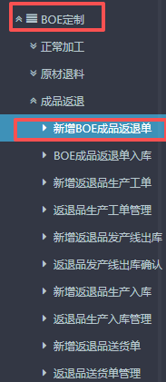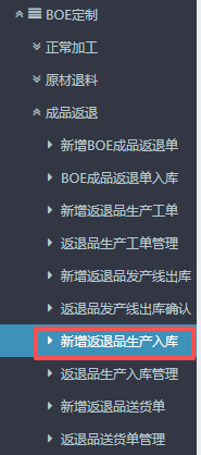 点晴ERP-BOE返退品生产入库流程 1.进入ERP系统之后,在左侧的功能菜单里找到“BOE定制”,点开“成品返退”,点击“新增返退品生产入库”。 2.进入界面后,按图操作:选择对应的订单子类型(正常返退品、制损品),然后选择对应入库仓库。 3.接下来下方点击“货品编码”,会弹出物料信息窗口。 在弹窗的...