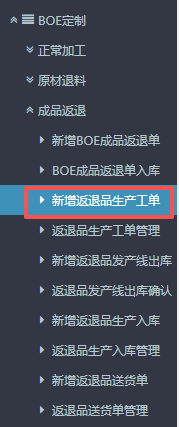 点晴ERP-BOE返退品生产工单流程 1.进入ERP系统之后,在左侧的功能菜单里找到“BOE定制”,点开“成品返退”,点击“新增返退品生产工单”。 2.进入界面后,按图操作:选择订单来源,备注有需要可补充。 3.接下来在下方找到“货品编码”点开,会有物料信息弹窗。 在弹窗的信息窗口内,按图操作:点击选择物料...