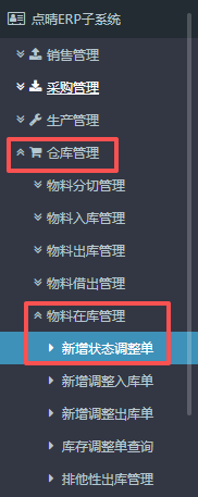 点晴ERP-BOE返退_自主重工转换流程 本教程是针对BOE成品返退流程中返退来源为“自主重工”,需要进行物料状态调整。注:如果是正常BOE返退品的话可直接到最下方的“BOE返退品流程”! 1.进入ERP系统之后,在左侧的功能菜单里找到“仓库管理”,点开“物料在库管理”,点击“新增物料状态调整单”。 2....