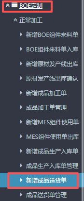点晴ERP-BOE成品送货单流程 1.进入ERP系统之后,点击“BOE定制”,点开“正常加工”,找到“新增成品送货单”。 2.进入界面之后,按图操作:点击选择销售客户,然后再点击选择送货类型。备注可根据情况补充。 3.接下来就是点击“货品编码”,会弹出物料信息界面。 弹出界面之后,先选择物料大类,然后点击查询(...