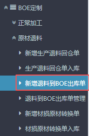 点晴ERP-BOE返退_返退品生产入库流程 1.进入ERP系统之后,在左侧的功能菜单里找到“BOE定制”,点开“成品返退”,点击“新增返退品生产入库”。 2.进入界面后,按图操作:点击选择入库仓库,备注可根据情况补充。 3.接下来下方点击“货品编码”,会弹出物料信息窗口。 在弹窗的物料信息窗口内,选择订...
