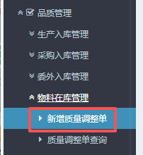 点晴ERP-质量调整单-操作流程 进入ERP系统之后,在左侧的功能菜单里找到“品质管理”,点开“物料在库管理”,点击“新增质量调整单”。 2.进入界面后,按图操作:先选择物料大类,然后点击查询。 注:如果有需要调整库存位置:先点击对应物料信息,然后点击右边的“按明细调整货位”并在右边勾上对应物料。 ...