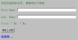 <% title=request.form("title") if title="mr" then %> 欢迎您 Mr.<% =request.form("fname") %> 。 <% elseif title="ms" then %> 欢迎您 Ms.<% =request.form("fname") %> 。 <% else %> <B><font color=blue> 欢迎您 <% =request.form("fname")&" "&request.form("lname") %> 。 </font></B> <% end if %>