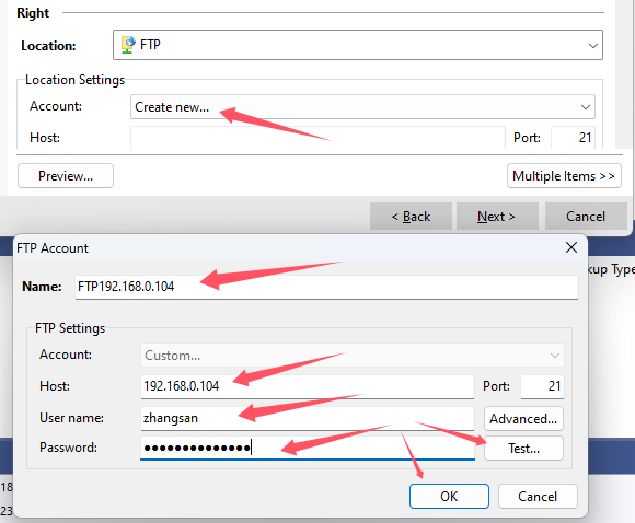 Right:备份目的地,Location也支持很多种,这里选择“FTP”,Account选择“Create new...”: