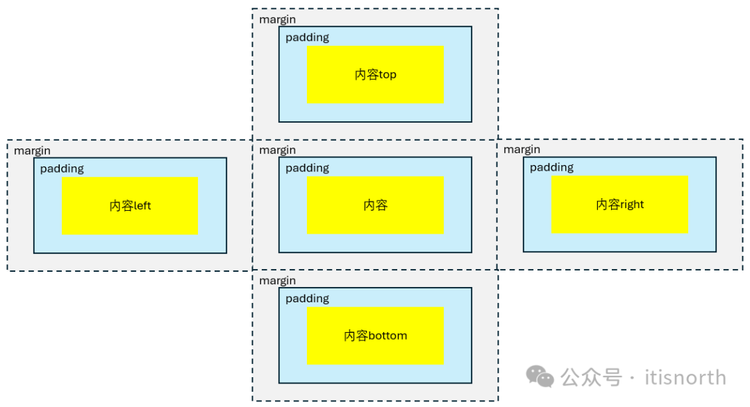 在最中间的内容块,它外面的浅蓝区域是 padding,注意看到它是内容与实线边框之间的区域。 而实线边框与最外层的虚线框之间的区域,则是 margin。 虚线框之外的地方,就是其它元素占据的区域。 这张图里,放置了内容块上右下左各一个元素区域,结合昨天介绍的边框的内容,是不是很熟悉? 外边距(margin)margin 本身就是个属性,不过它和 border 一样,是个简写。 那自然,如果不简写,需要用到的属性如下: