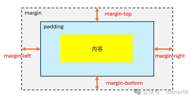 前面介绍了边框,一个元素除了边框这种能看见的,它还有两个看不见的空间,就是外边距(margin)和填充(padding)。 为方便起见,以下直接使用 margin 和 padding 叙述。 margin 定义元素与外部元素之间的间距,而 padding 定义的,是元素自身边框与元素内容之间的间距。 咱们看一张图就清楚了。