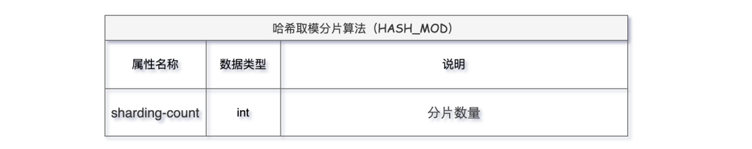 哈希取模分片算法是内置取模分片算法的一个升级版本,定义算法时类型HASH_MOD,也只有一个props属性sharding-count代表分片的数量。表达式hash(分片健/数据库实例) % sharding-count。