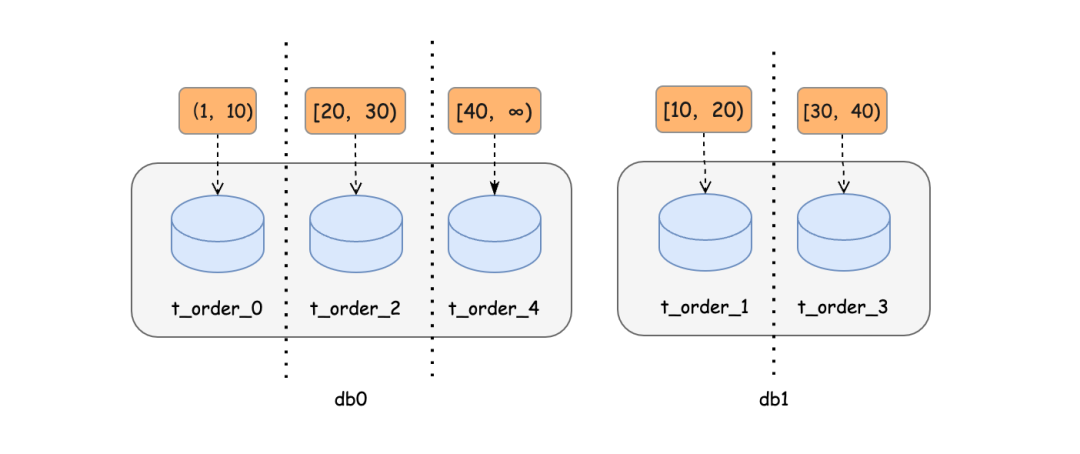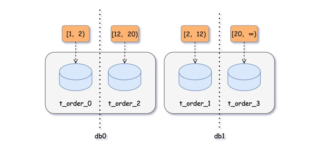 这个配置的意思就是说,分片健t_order_id的值在界值 [range-lower,range-upper) 范围内,每个分片表最大存储 10 条数据;低于下界的值 [ 1,2 ) 数据分布到 t_order_0,在界值范围内的数据 [ 2,20 ) 遵循每满足 10 条依次放入 t_order_1、t_order_2;超出上界的数据[ 20,∞ ) 即便前边的分片表里未满 10条剩下的也全部放在 t_order_3。
