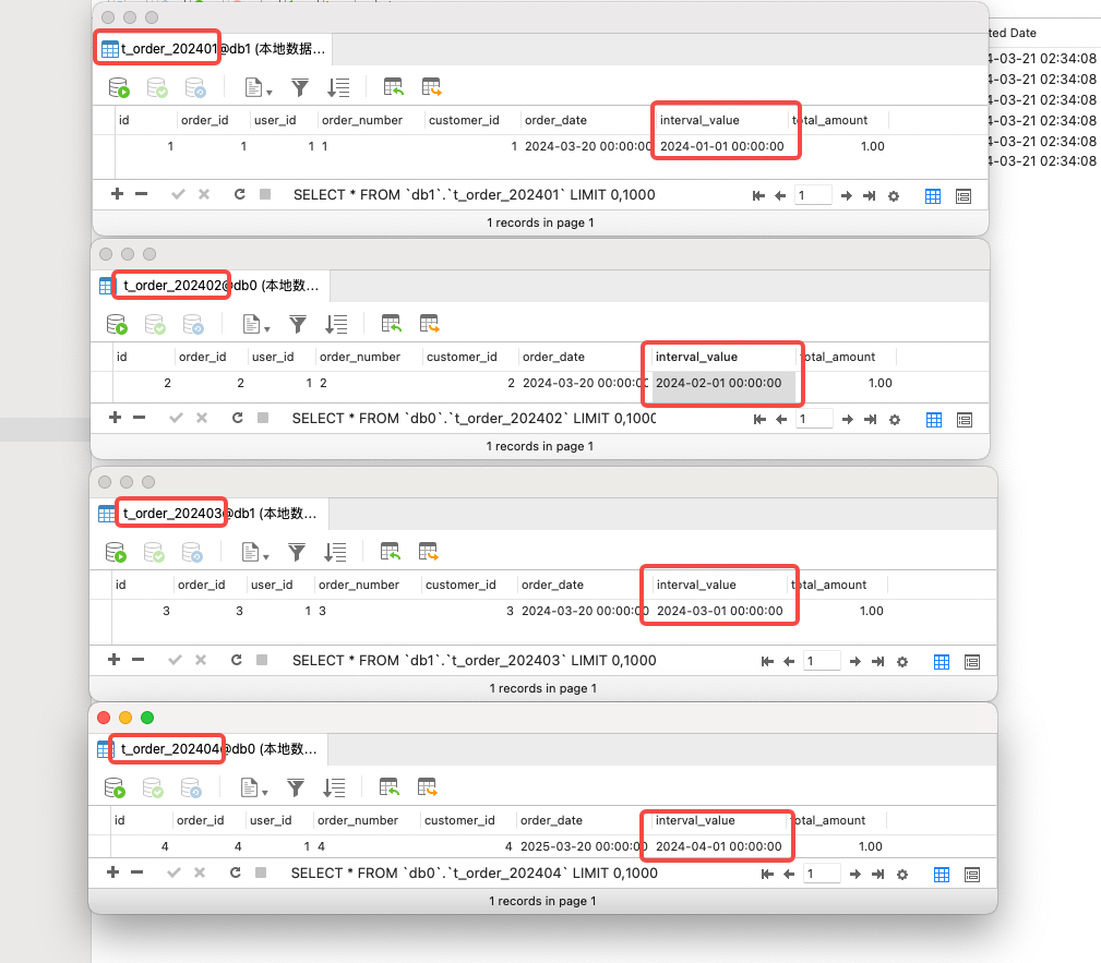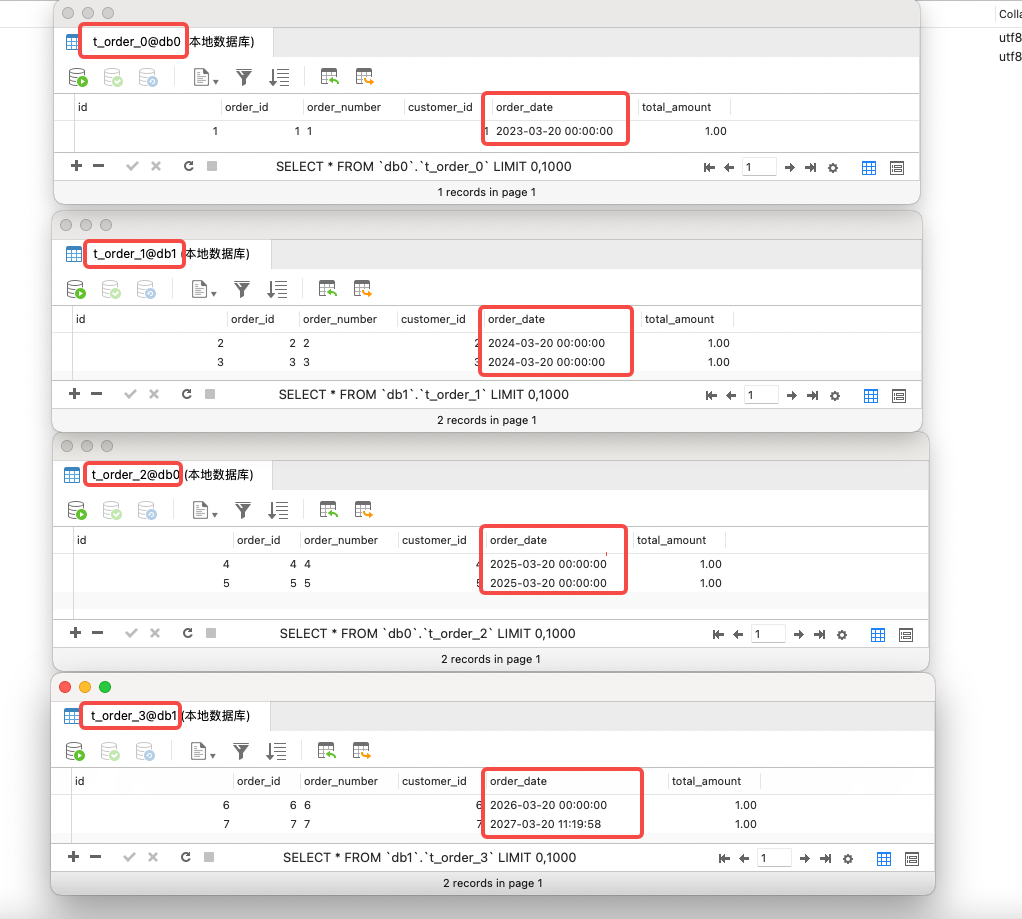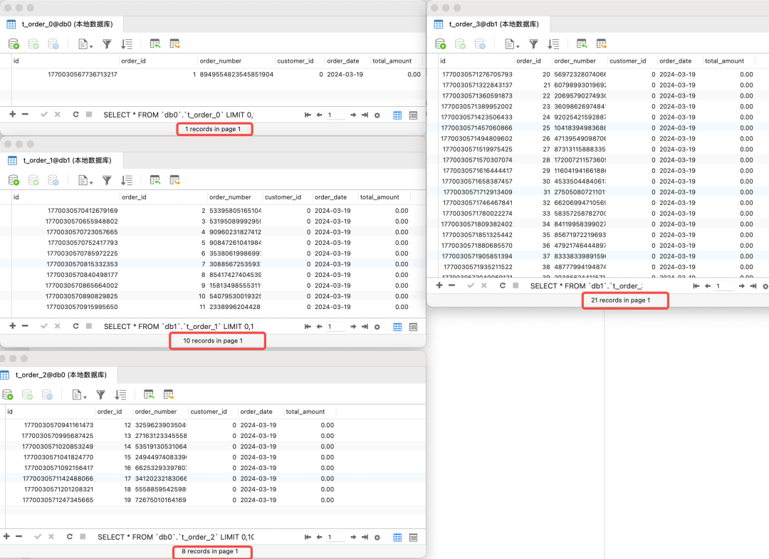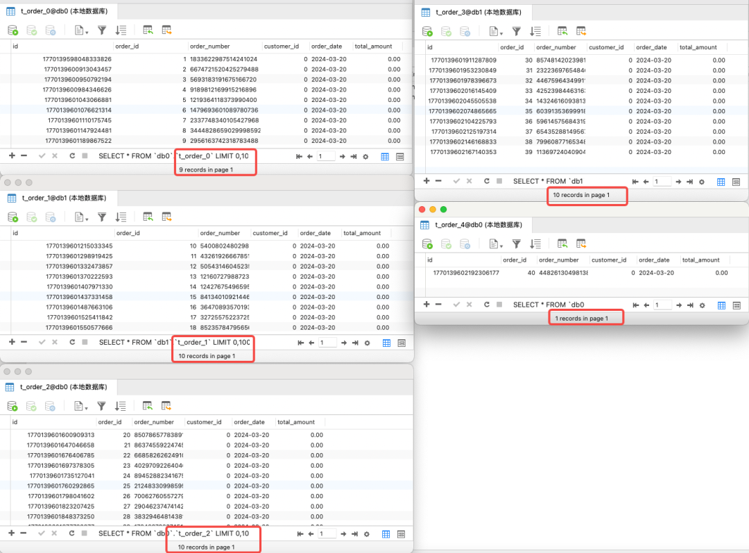 接着准备插入40条数据,其中分片健字段t_order_id值从1~40,我们看到实际插入库的数据和上边配置的规则是一致的。超出range-lower、range-upper边界的部分数据,比如:t_order_2表未满 10条也不再插入,全部放入了t_order_3分片表中。