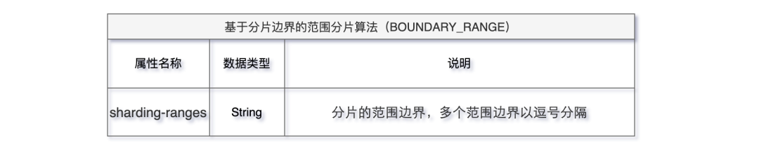 基于分片边界的范围分片算法,和分片容量算法不同,这个算法根据数据的取值范围进行分片,特别适合按数值范围频繁查询的场景。该算法只有一个属性sharding-ranges为分片健值的范围区间。