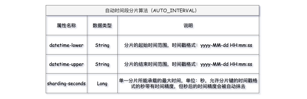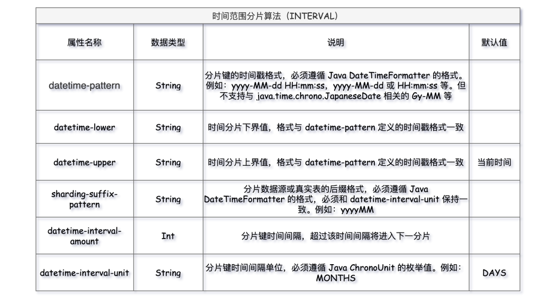 datetime-interval-unit: "MONTHS" # 分片键时间间隔单位,必须遵循 Java ChronoUnit 的枚举值。例如:MONTHS