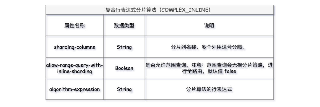 复合行表达式分片算法,适用于多分片健的简单分片场景,和行表达式分片算法使用的方式基本一样。多了一个属性sharding-columns分片列名称,多个列用逗号分隔。特别注意:使用多分片键复合算法,一定要基于复合分片策略进行设置。