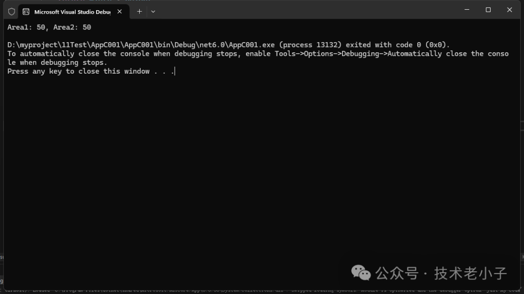 Console.WriteLine($"Area1: {area1}, Area2: {area2}");