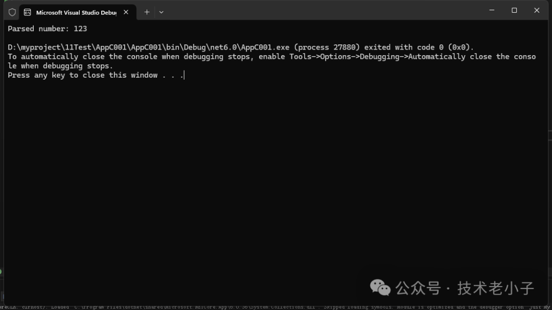Console.WriteLine($"Parsed number: {number}"); // 输出: Parsed number: 123