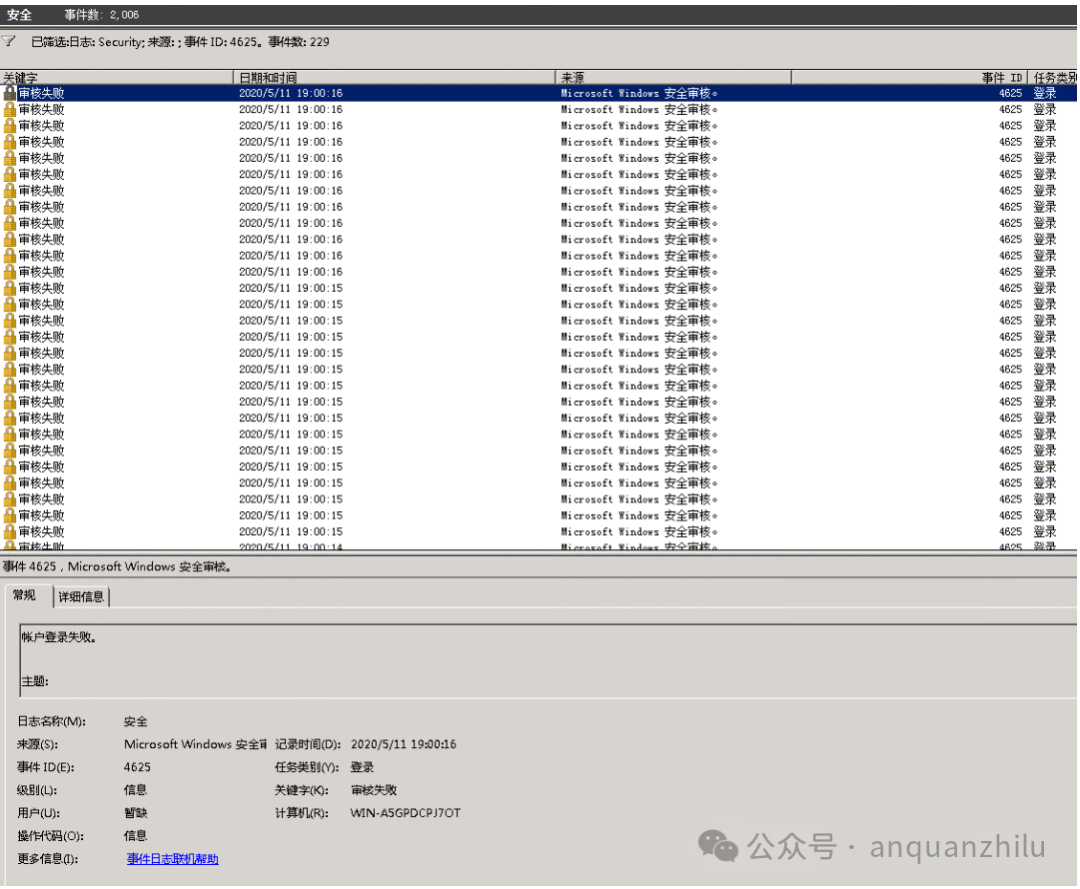 如果发现大量连续的4625事件,特别是针对同一用户账户,这通常表明服务器可能正在遭受RDP暴力破解攻击。