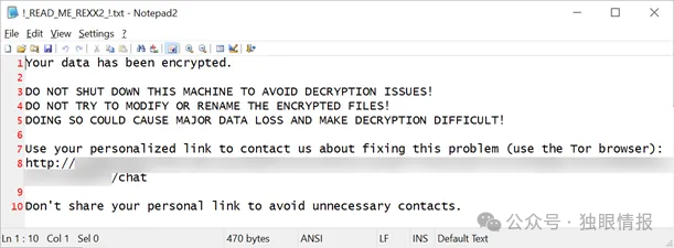6. 勒索软件部署:最终,攻击者部署勒索软件,加密文件并添加随机扩展名,同时放置名为!_READ_ME_REXX2_!.txt的勒索信。