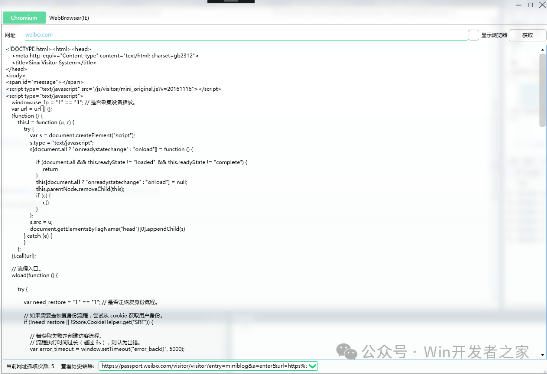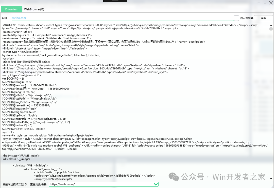 比如打开weibo.com时,会获取到多次页面源码,结果如下(这里只贴出前面两次的结果):