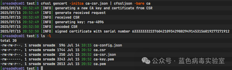 cfssl gencert -initca ca-crs.json | cfssljson -bare ca