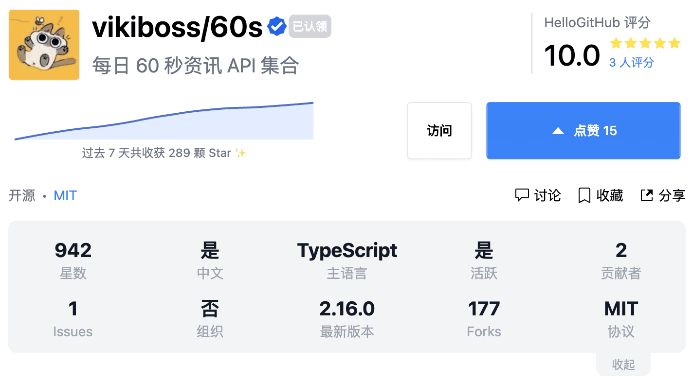 项目详情→hellogithub.com/repository/vikiboss/60s