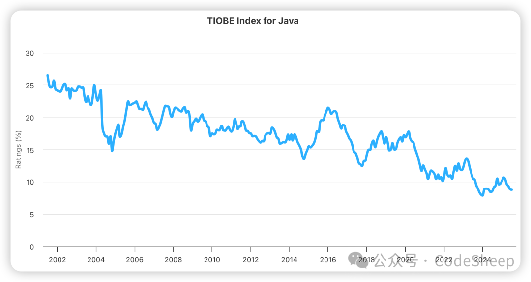 TIOBE 编程社区相信大家都听过,这是一个查看各种编程语言流行程度和趋势的社区,每个月都有榜单更新,每年也会有年度榜单和总结出炉。 昨晚在家整理浏览器收藏夹时,才想起了 TIOBE 社区,于是打开看了一眼最近的 TIOBE 编程语言社区指数。 ![]() 没想到,Java 居然已经跌出前三了,并且和第一名 Python 的差距也进一步拉开到了近 18%。 ![]() 回想起几年前,Java 曾是何等地风光。 各种基于 Java 技术栈所打造的 Web 后端、互联网服务成为了移动互联网时代的中坚力量,同时以 Java 开发为主的后端岗位也是无数求职者们竞相选择的目标。 然而这才过去几年,如今的 Java 似乎也没有了当年那种无与争锋的强劲势头,由此可见 AI 领域的持续进化和繁荣对它的冲击到底有多大。 用数据说话最有说服力。 拉了一下最近这二十多年来 Java 的 TIOBE 社区指数变化趋势看了看,情况似乎不容客观。 可以明显看到的是一个:呈震荡式下降的趋势。 ![]() 现如今,Java 日常跌出前三已经成为了常态,并且和常居榜首的 Python 的差距也是越拉越大了。 在目前最新发布的 TIOBE Index 榜单中排名前十的编程语言分别是:
