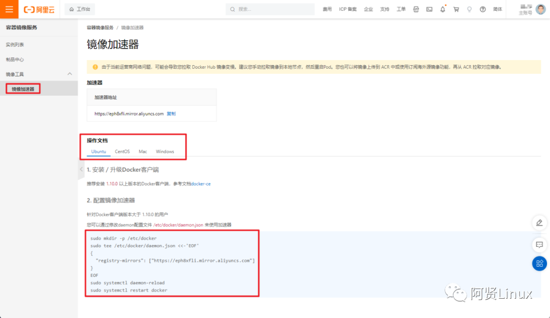 • 阿里云:https://<你的ID>.mirror.aliyuncs.com