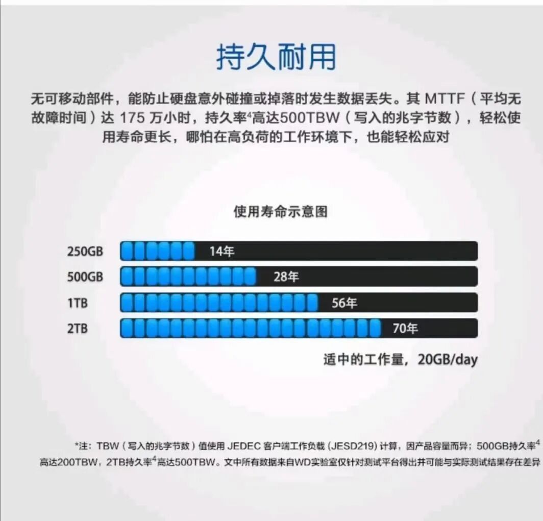笼统的判断固态硬盘的使用寿命可通过“TBW”参数来判断,不同厂家因“存储芯片质量”、“写策略”等不同,同容量的固态硬盘的BTW也可能不同: