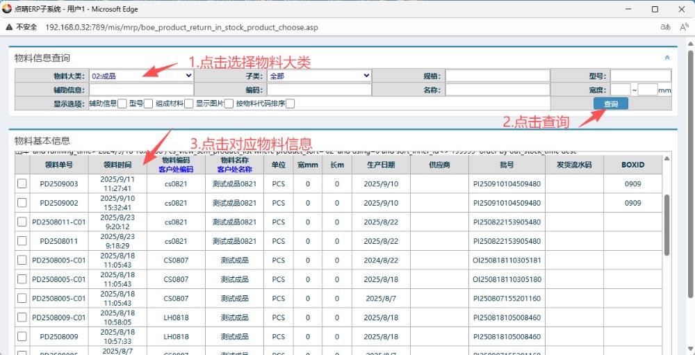 6.进入界面后,按图操作:可用“代码”或“名称”筛选,点击查询。然后点击对应物料信息,先进行入库,再上传BOE