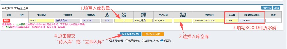 4.  选好物料后,按图操作:填写入库数量,选择入库仓库(要与上面一致),填写BOXID和流水码。根据情况选择提交“待入库”或“立即入库”。