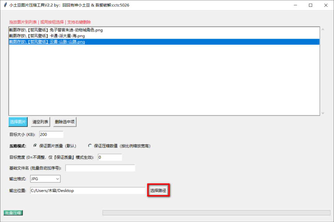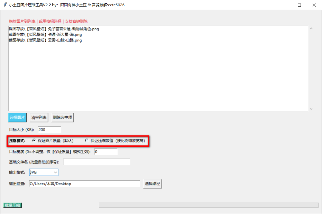 软件由吾爱大佬原创,采用python编写,完全免费,单文件免安装,最大的特点就是支持将图片压缩到指定大小,支持批量压缩,支持拖入添加文件。