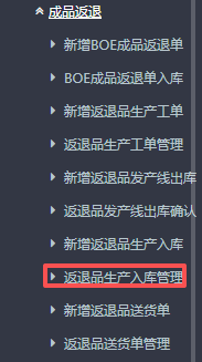 1.进入ERP系统之后,在左侧的功能菜单里找到“BOE定制”,点开“成品返退”,点击“新增返退品生产入库”。