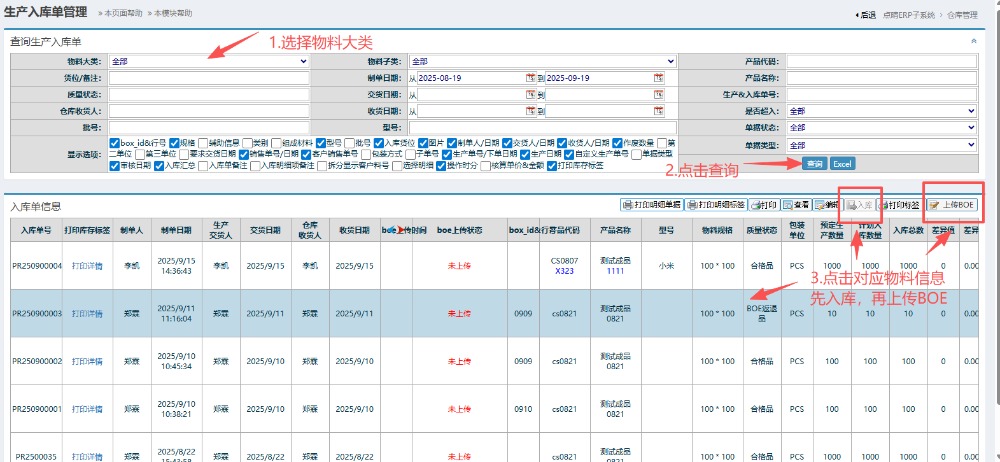 6.进入界面后,按图操作:点击选择物料大类,点击查询。然后点击对应物料信息(合格品或制损品),先进行入库,再上传BOE