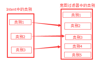 (1)Intent中的类别必须全部匹配<intent-filter>中的<category />,但是<intent-filter>中多余的<category />将不会导致匹配失败。