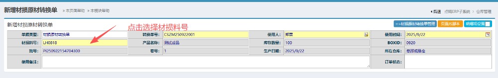 4.提交后,返回到左侧的功能菜单,找到并点击“材损原材转换单入库