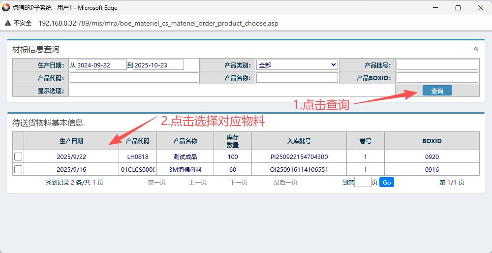 5.进入界面后,按图操作:可用代码或名称筛选物料,然后点击查询点击对应物料信息,先进行确认,再上传BOE