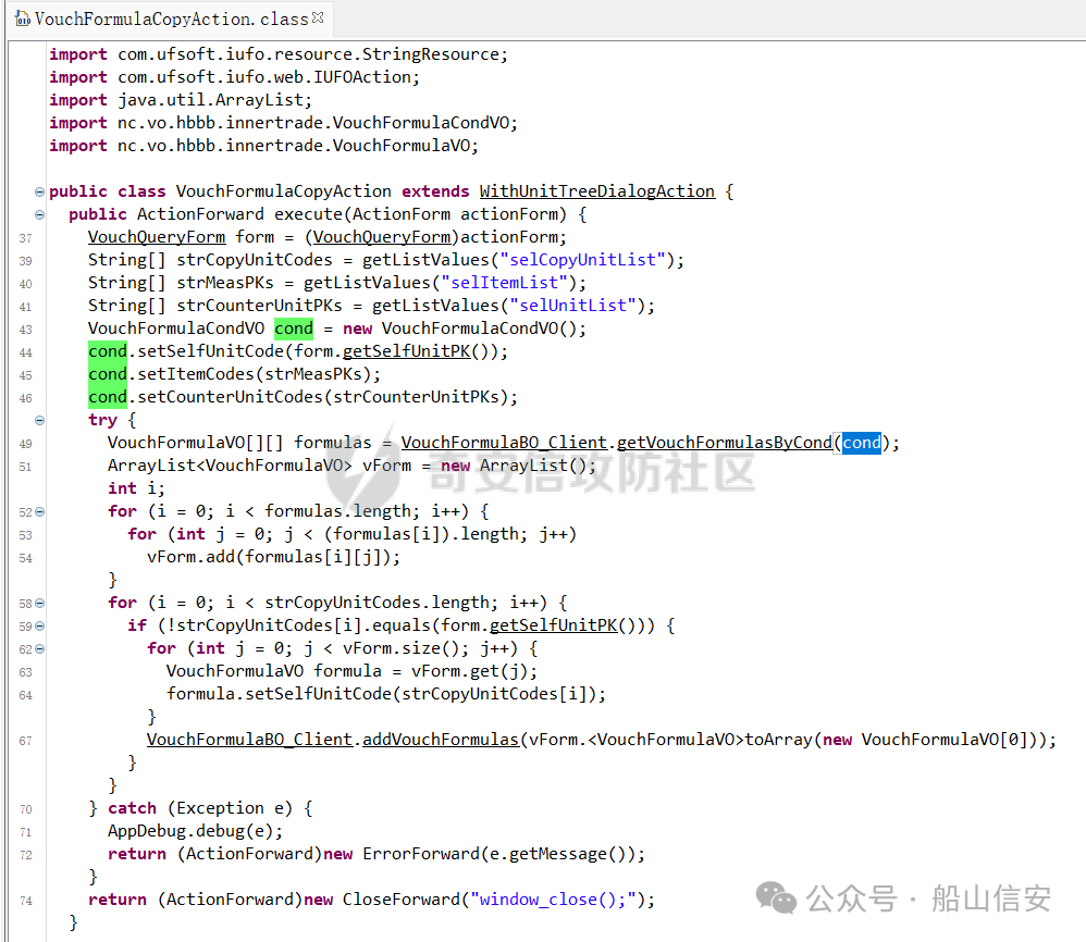 可以反向定位一下,这些传参进了哪些方法当中,可以看到VouchFormulaCondVO中保存了上面的传参,再作为cond传入了getVouchFormulasByCond