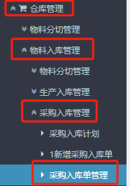 ​1.进入ERP系统后,在上方或者左侧点击“仓库管理”》“物料入库管理“》“采购入库管理”》”采购入库单管理“。