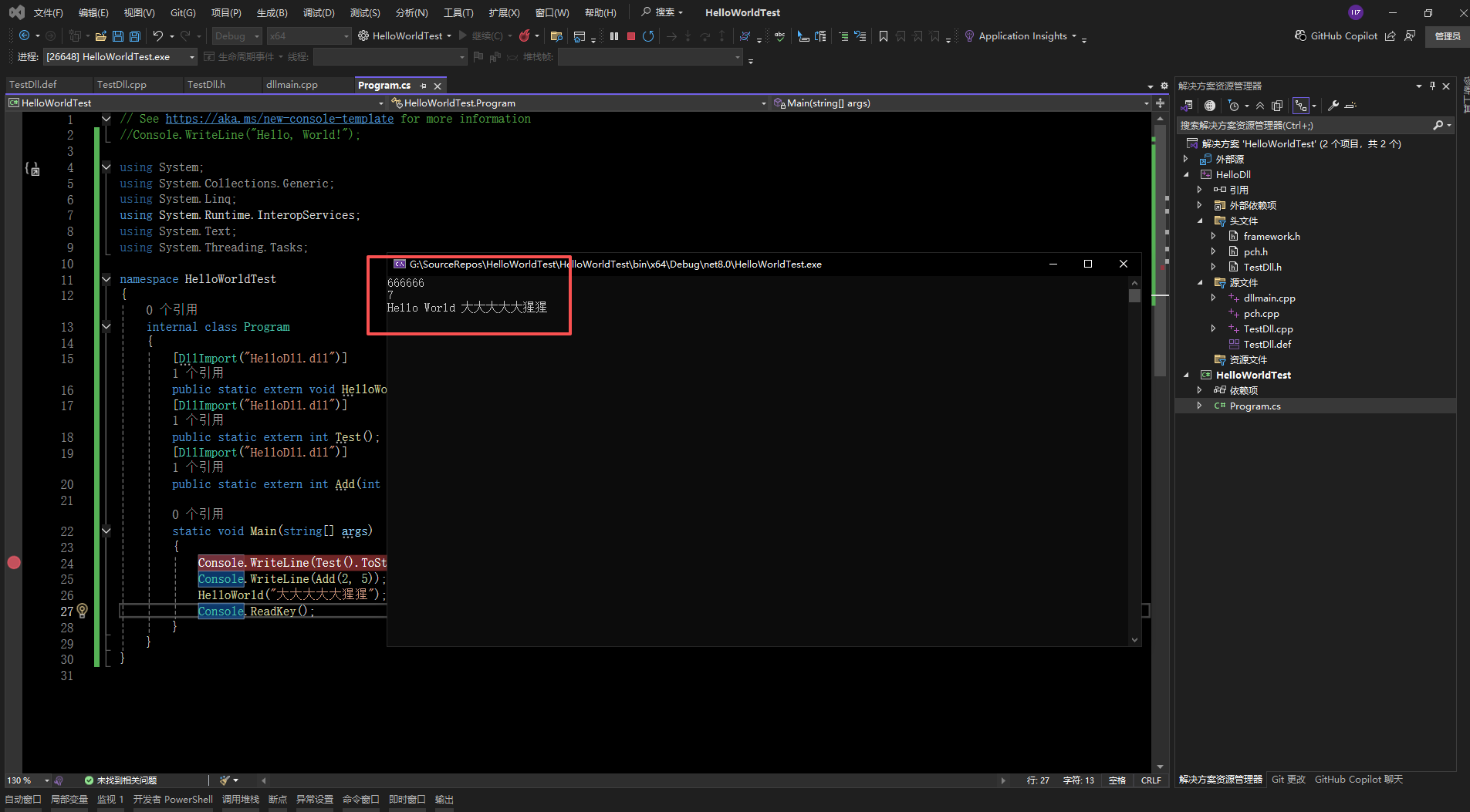 然后在 TestDll.cpp 文件 添加代码,如下 #include "pch.h" #include "TestDll.h" #include<iostream> void HelloWorld(char* name) { std::cout << "Hello World " << name << std::endl; } int Test() { return 666666; } int Add(int a, int b) { return a + b; }