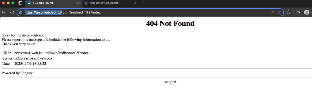 SSL 配置同上,不再赘述。这样配置好以后其实有一个问题,直接输入https://test-web.leti.ltd/会跳转到登录页面,但这时如果你刷新页面的话,会提示 404。
