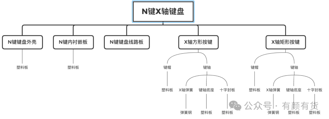 • 物料清单(BOM):是产品结构的技术性描述文件,它表明了产品组件、子件、零件直到原材料之间的结构关系,以及每个组装件所需要的各下属部件的数量,物料清单是一种树形结构。(BOM是MRP的基础,如果BOM表有误,则所有物料需求都会不正确。)这里展示一个某产品BOM结构示意图: