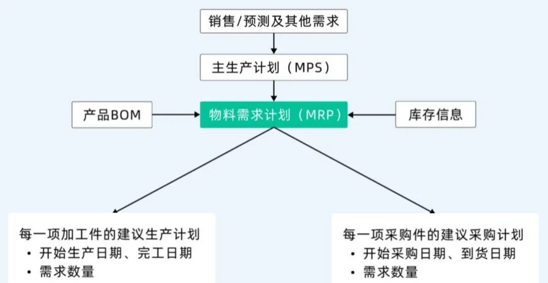 物料需求计划(MRP)基于需求预测、库存状态和生产计划,来计算每一项物料的具体需求量和需求时间的管理方法。它通常适用于依赖于多种原料、部件和组件的生产流程。MRP的主要目的是确保在正确的时间,以正确的数量,把正确的物料送到生产线。
