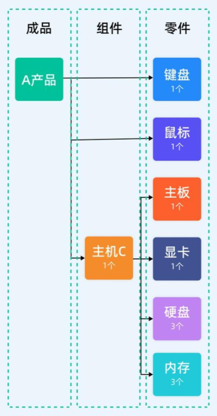 物料清单(BOM,Bill of Materials)是一份详细的列表,列出了生产最终产品所需要的所有原材料、部件及其数量。它就像是产品的“配方”或“食谱”,用来指导生产过程中需要哪些物料、数量及其顺序。BOM对于MRP系统非常重要,因为它帮助系统理解每种物料在生产过程中所扮演的角色,并计算出每个组件的需求。